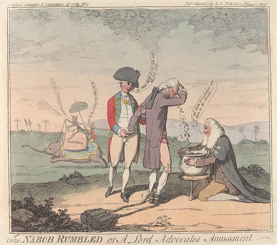 But the rewards for this risk were sublime. The territory was awash with gems, gold and ivory. Entire rooms in London Georgian homes were given over to hosting Mughal treasures. The phrase ‘loot’ also enters the English language at the same time, originally a Hindustani slang term for plunder. Another contemporary phrase was ‘Nabob’, which came to be a term of insult used in Britain for brash young men returning from India flush with wealth. Gillray even drew this satire, ‘The Nabob Rumbled’ (1783):