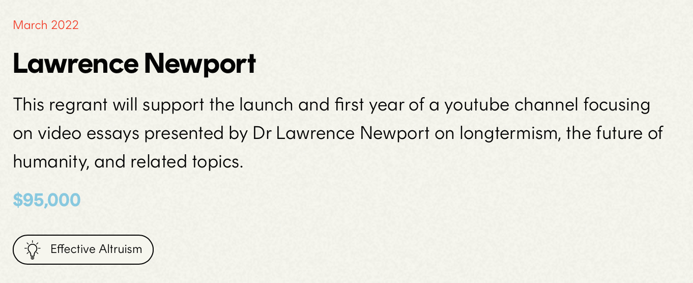 It reminds me much of Dr Lawrence Newport’s YouTube channel (preceding ‘Looking For Growth’) for which he was given a $95,000 ‘regrant’ to fund the first year of a YouTube channel featuring video essays on his top topics by Sam Bankman-Fried’s FTX future fund in March 2022. Below: