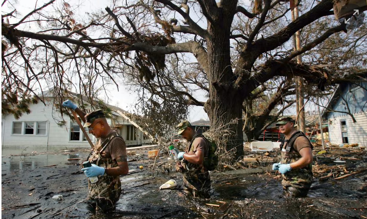 It is worth providing an overview of Katrina. As a category 5 hurricane it wrought devastation on New Orleans, killing over 1,800 people and costing $125 billion. It overwhelmed the neglected levee system, which was comprised of piecemeal and sometimes incomplete redevelopments which had taken place over the course of the 20th century. 80% of the city, including many predominantly black urban developments which had expanded into below level swamp land in the post-war period, were flooded, leading to the ultimate displacement of nearly a quarter of a million people. Evacuation orders were issued only 20 hours before landfall, leading to a haphazard exodus of those who could exit in time and the internal displacement of the remainder of residents to the higher ground areas of the city. In particular, Caesar’s Superdome became an infamous site of impromptu refugees, eventually holding up to 20,000 people with no meaningful sanitation system and a precarious system of rationing.