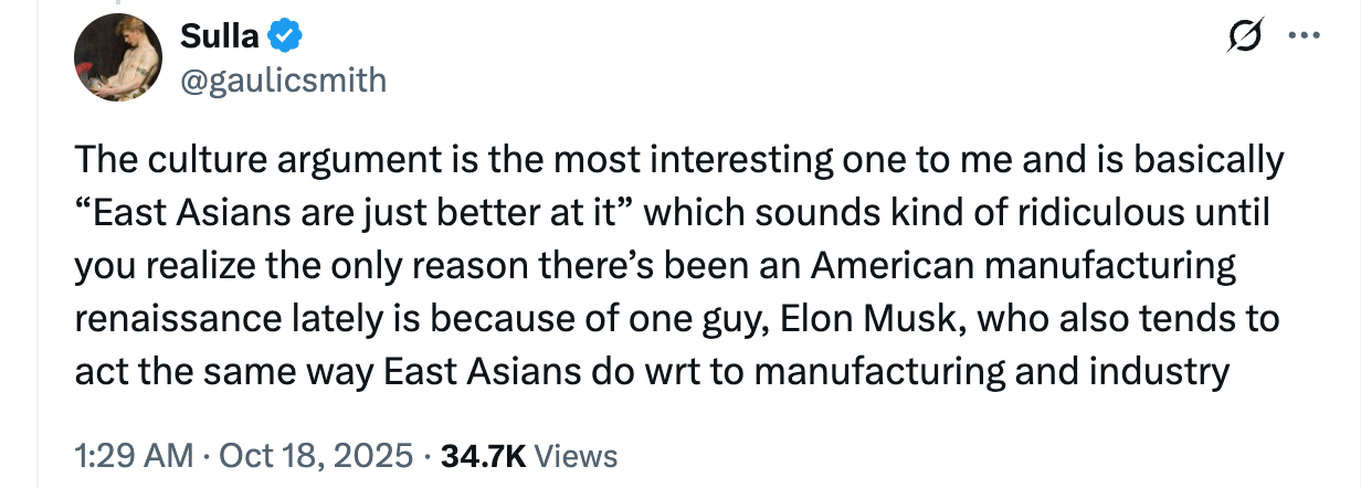 Can we entirely dispense with the nation-state? I cannot see how you could build something like SpaceX in a Moldbuggian Sovereign corporation. If you can’t build a car park under a local council, how do you suspect a city-state in which all property owners are also shareholders in the central authority will treat infrastructure projects? The ‘patchwork’ model is a recipe for the remaining Westerners to crowd into a small network of pseudo-sovereign city states while China handles all advanced manufacturing.