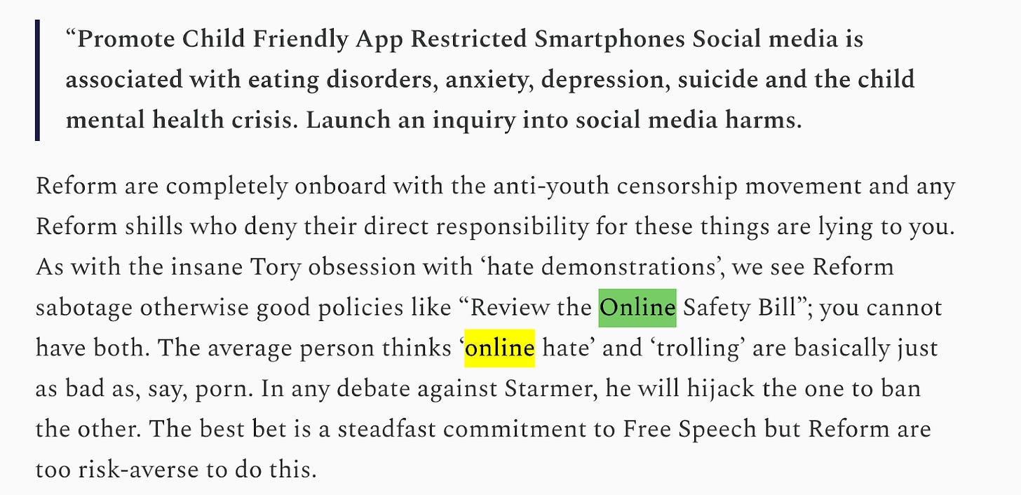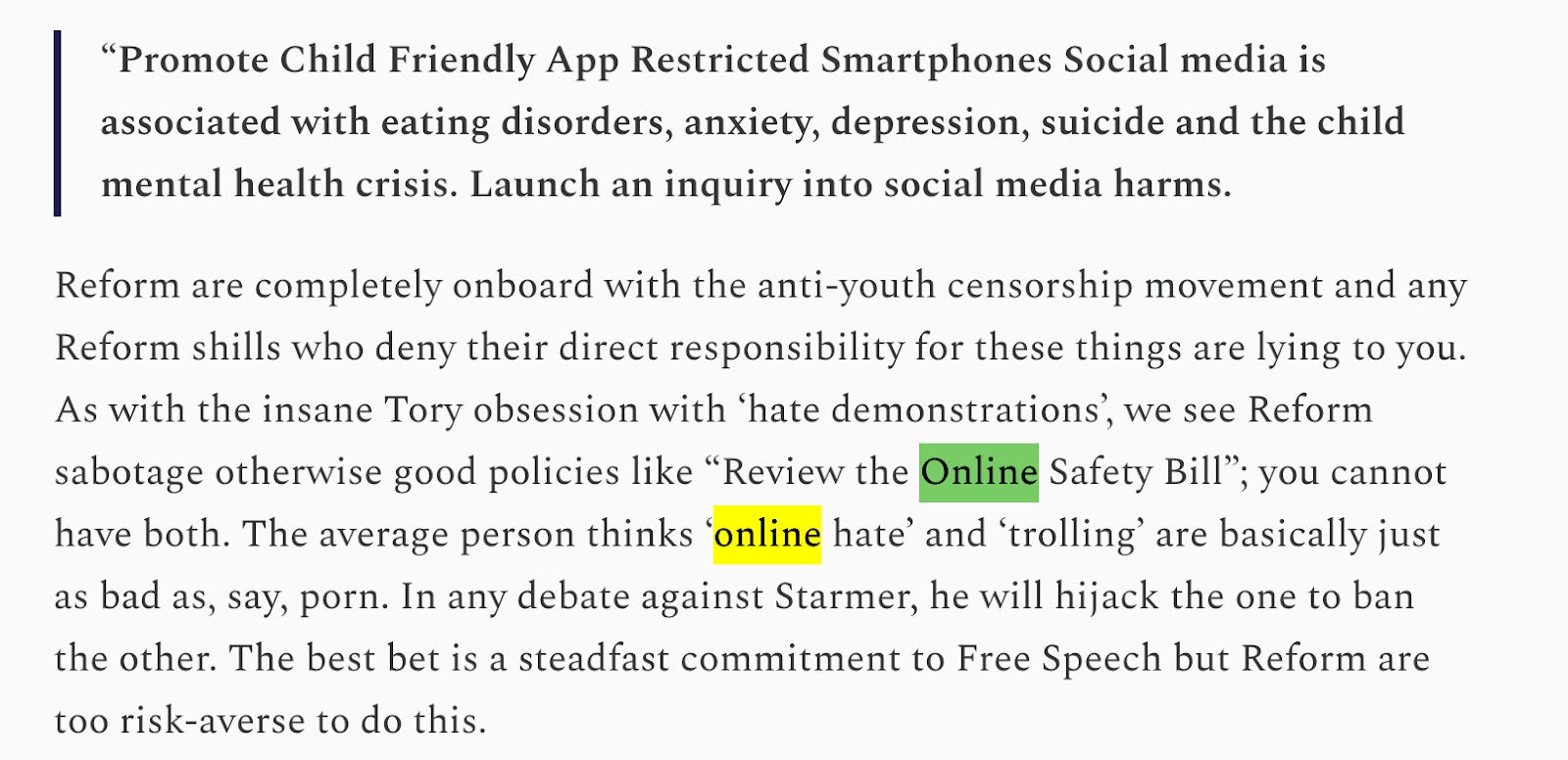 I, cordially, disavow my colleague’s article on Sunday but I have better things to do with my life atm than respond to it. I shall limit myself to this. The 2024 Reforce manifesto openly endorsed the Online Safety Act; Reforce M.Ps and all Reforce employees support censoring you and if they, or any of their defenders, deny this know that you are being lied to. As J’accuse covered in June 2024: