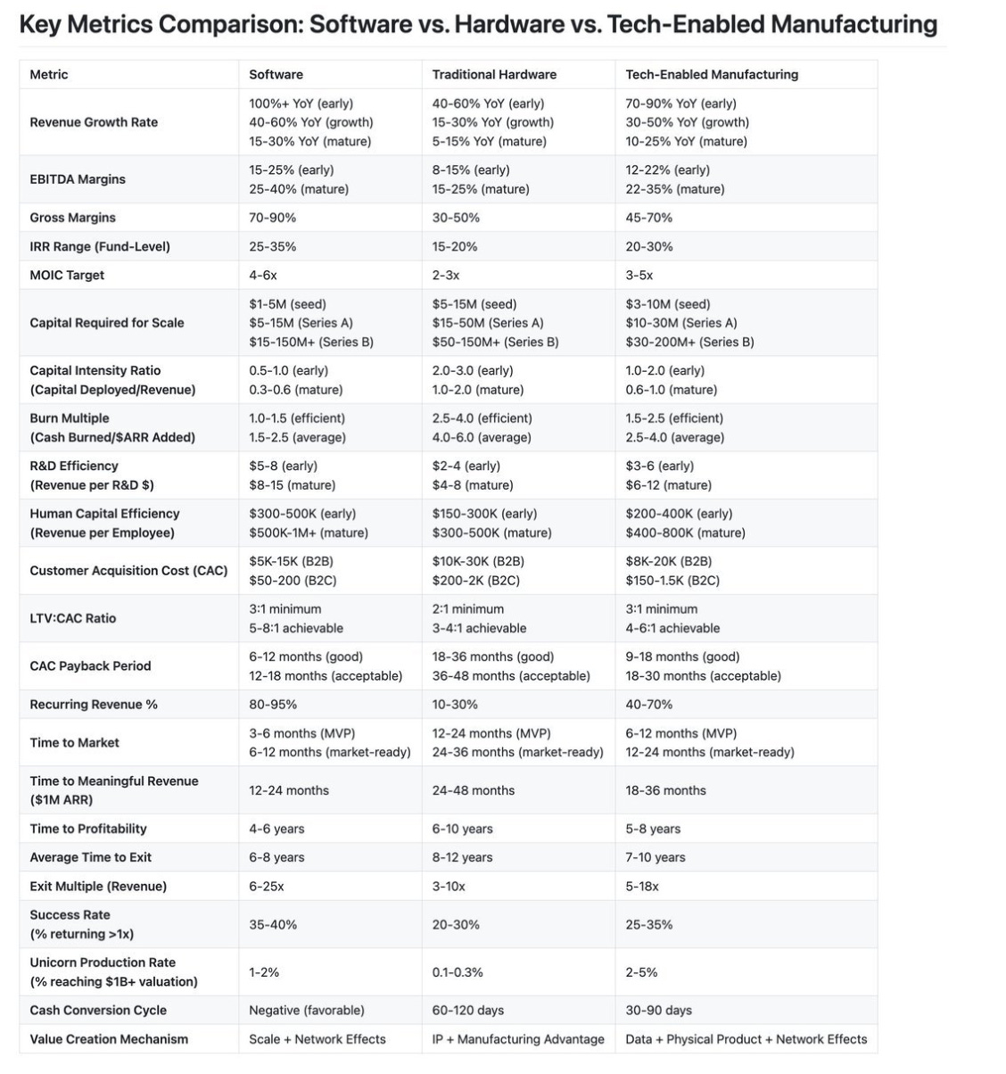 Attached below is a chart compiled by Aaron Slodov via AI which categorizes the capital metrics of software, hardware, and tech-enabled manufacturing. Generally speaking, venture capital was designed with short fund lifespans seeking out capital-light, high-margin software.