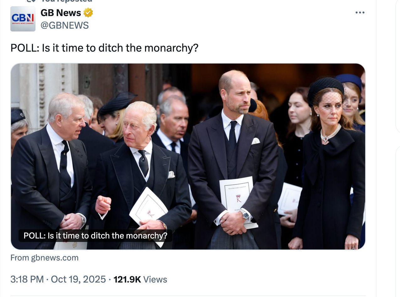 “Reality is downstream of J’accuse” as my colleague has said. In 2022, when the following article was written, it was simply assumed to be a matter of fact that to be ‘on the Right’ in Britain meant Monarchism; grown men would opine about ‘based’ Charles III dissolving Parliament, even radicals felt that the Monarchy was still better than the alternatives. Today, even High Tory Gang alumni are wary of openly expressing support for Woke King Chuck’s Guelph mafia. The following poll was conducted by G.B News, Britain’s exclusively right-wing news channel: