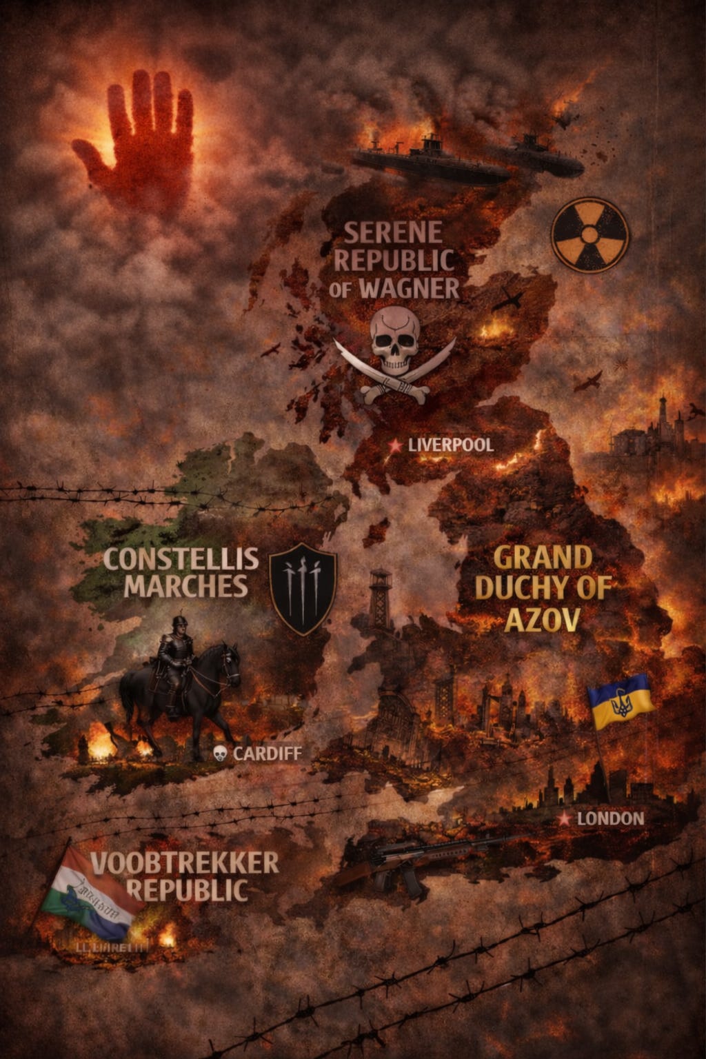 Landing in Northumberland a fleet of Russian submarines carrying the reconstituted Wagner Group, who establish a Republic extending south to Liverpool. To the West, Erik Prince arrives from Ireland with his Constellis group to conquer Wales, which is renamed The Marches. On the coasts of Devon and Cornwall come large groups of White South African refugees, who establish a Voortrekker Republic. In Northern Ireland the men of Ulster, the only natives with any agency, abandon their homes and become a nomadic fighting people, extinguishing life wherever they roam.